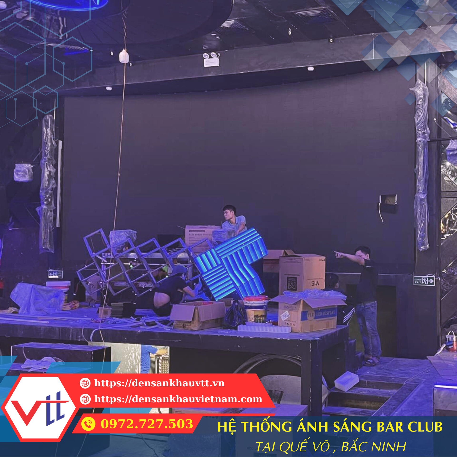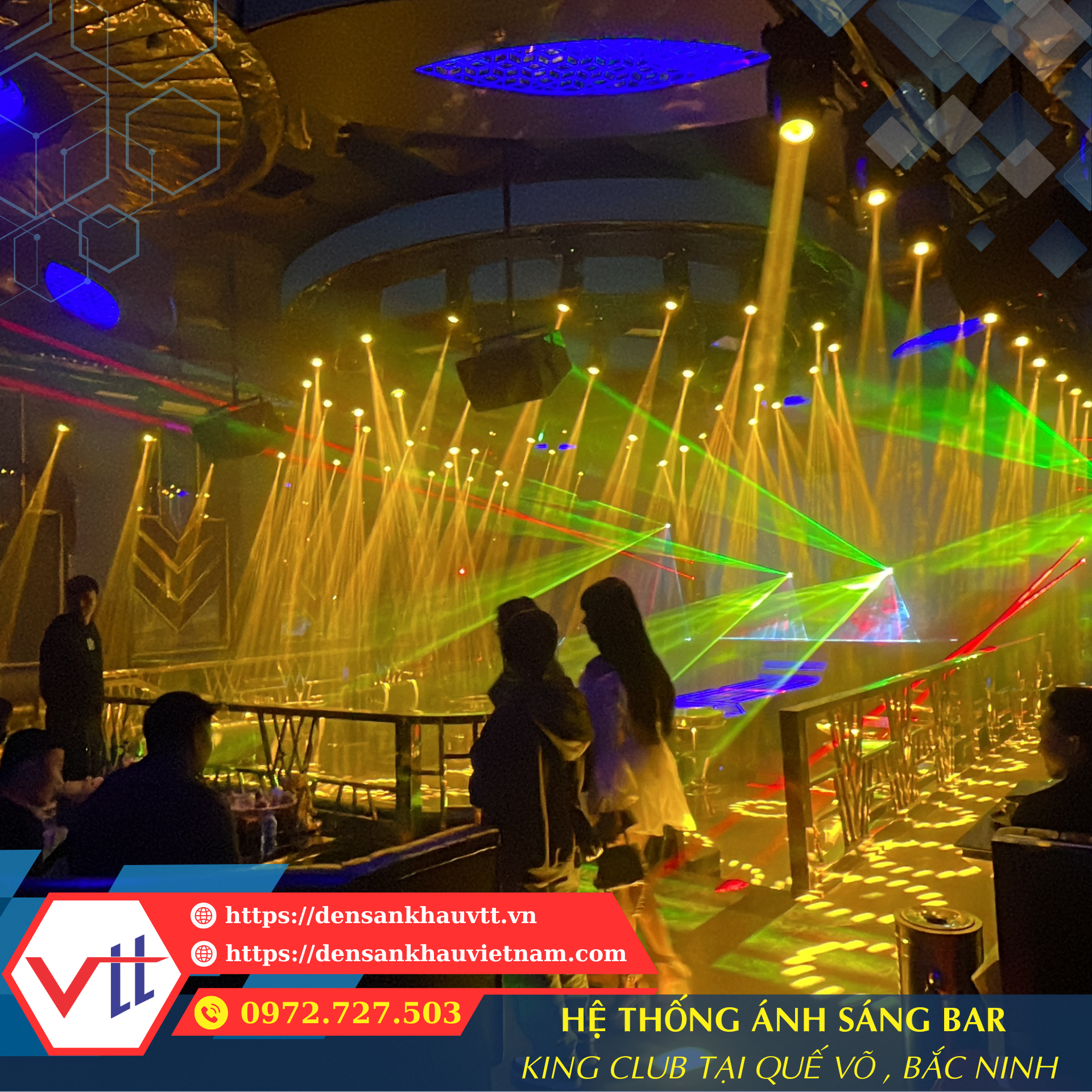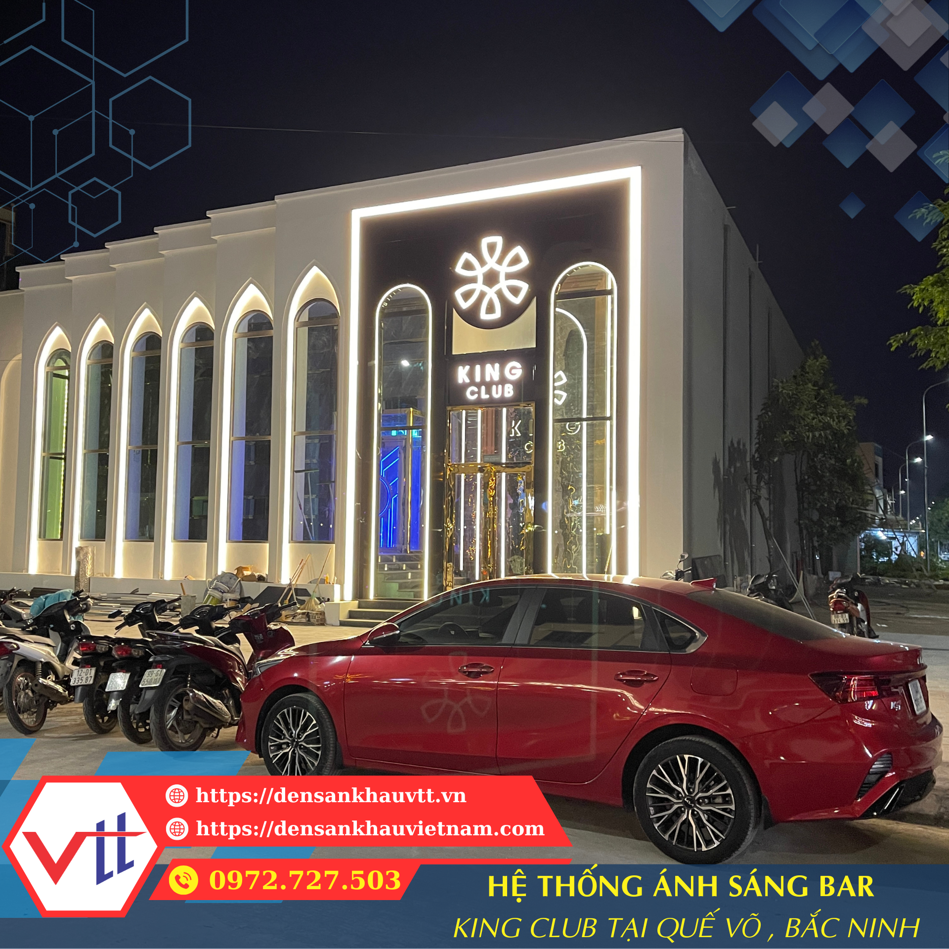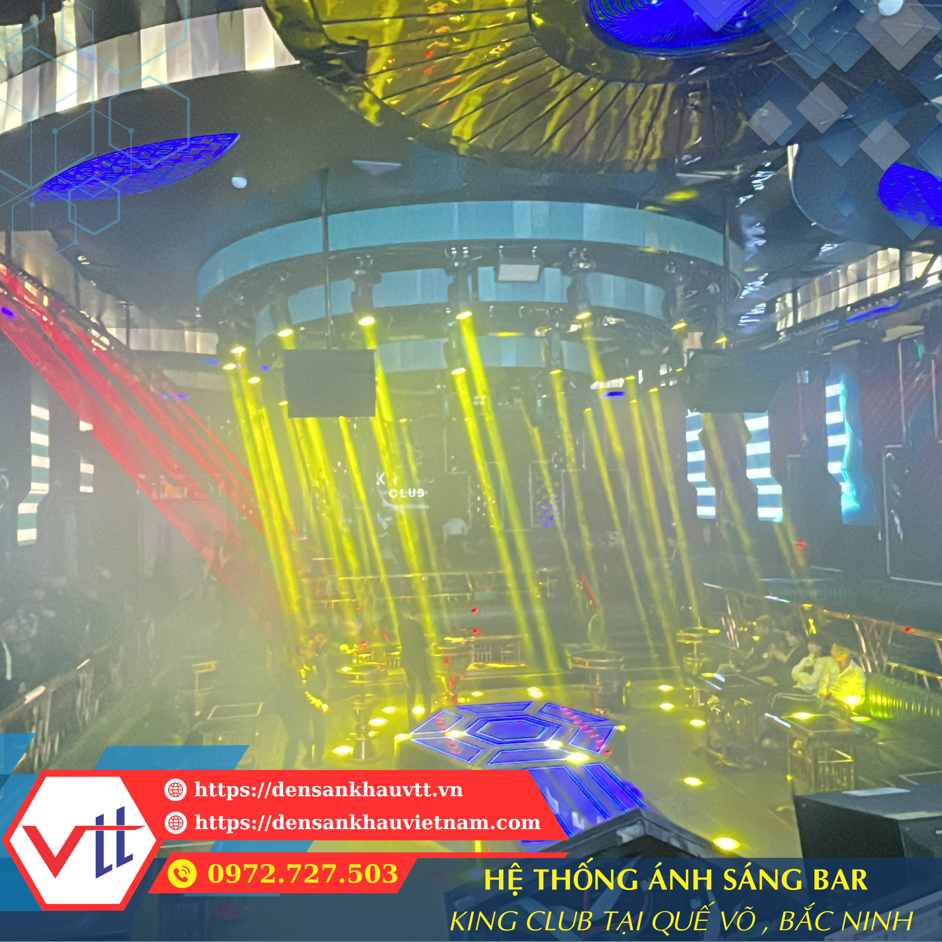 Bar King Club – Quế Võ, Bắc Ninh là địa điểm giải trí hiện đại, được đầu tư mạnh về âm thanh và ánh sáng nhằm mang lại trải nghiệm hoàn hảo cho khách hàng. Đèn Sân Khấu VTT tự hào là đơn vị thi công hệ thống ánh sáng sân khấu bar tại đây, từ khâu thiết kế, bố trí, đến lắp đặt và lập trình ánh sáng theo từng concept âm nhạc.