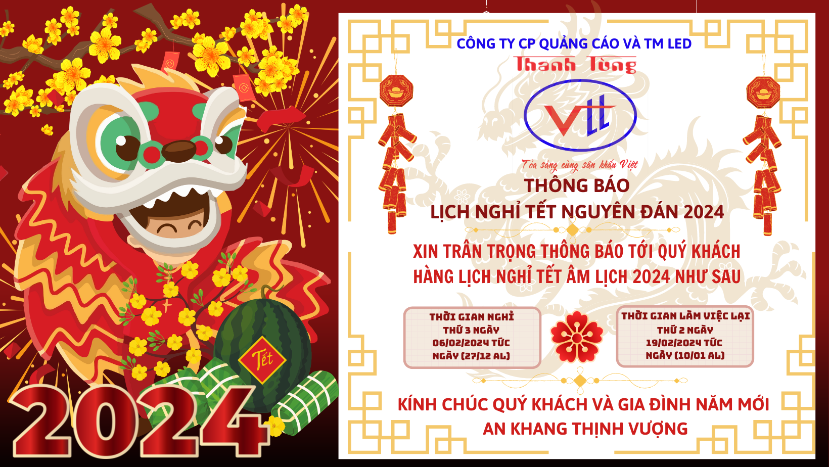 Thanh Tùng VTT Xin trân trọng thông báo lịch nghỉ Tết Nguyên Đán Giáp Thìn 2024 đến Quý khách hàng như sau: